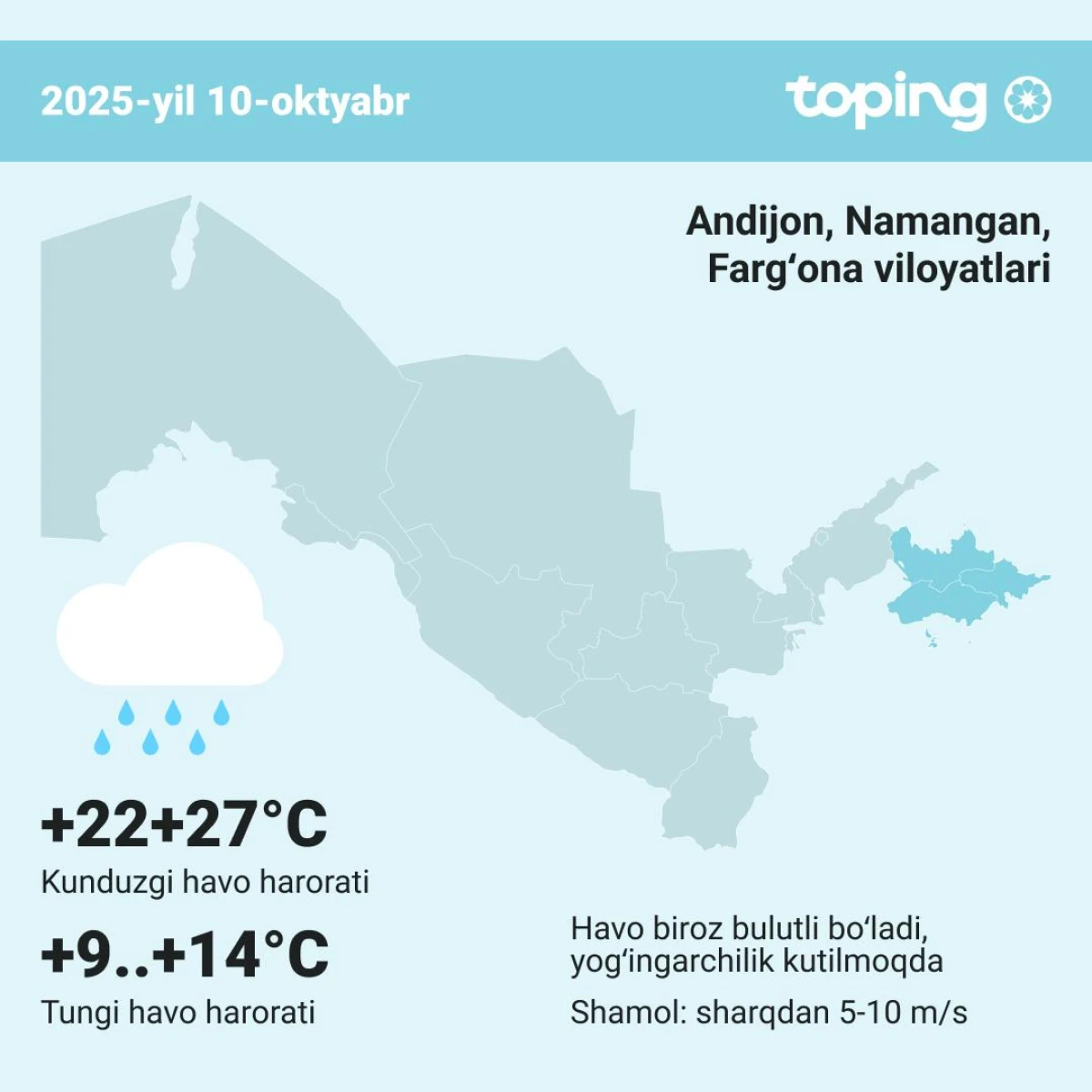 Havo biroz bulutli bo‘ladi, ayrim joylarda biroz qisqa muddatli yomg‘ir yog‘ishi mumkin. Shamol sharqdan 5-10 m/s tezlikda esadi. Harorat kechasi 9-14°, kunduzi 22-27° bo‘ladi.