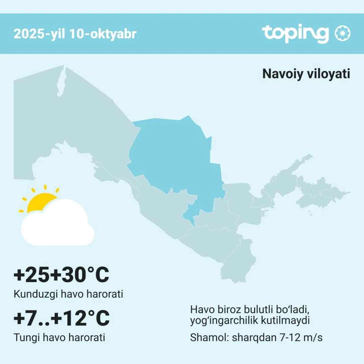 Havo biroz bulutli, ba’zi joylarda o‘zgaruvchan bo‘ladi, yog‘ingarchilik kutilmaydi. Shamol sharqdan 7-12 m/s tezlikda esadi. Harorat kechasi 10-15°, kunduzi 25-30° bo‘ladi.