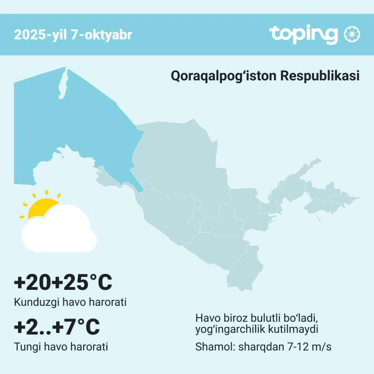 Havo biroz bulutli bo‘ladi, yog‘ingarchilik kutilmaydi. Shamol sharqdan 7-12 m/s tezlikda esadi. Harorat kechasi 5-10°, kunduzi 23-28° bo‘ladi.